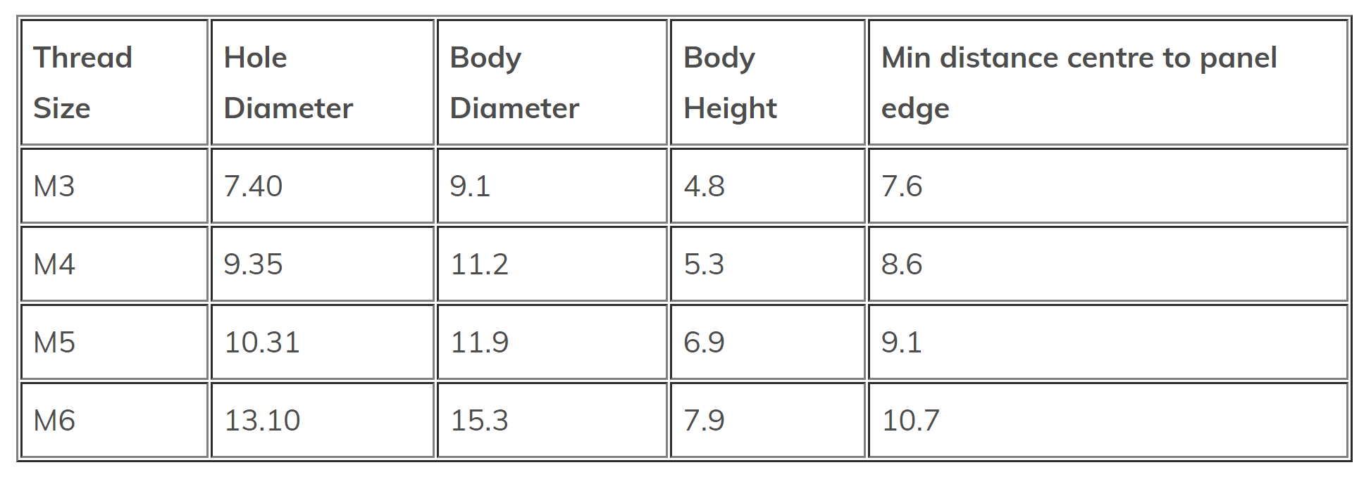 This METRIC range are made of 300 series stainless steel and are suitable for installation in material of up to HRB70 hardness. Install using a press with a hollow punch to apply pressure on the outer flat ring of the body only.
