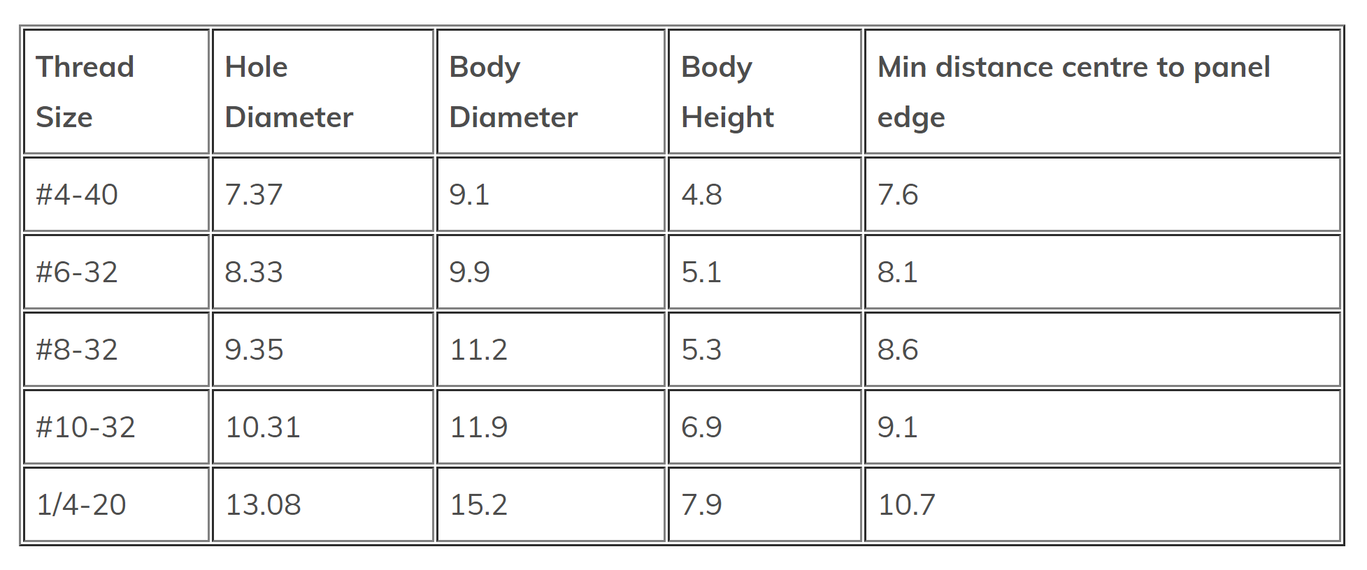 This UNIFIED range are made of 300 series stainless steel and are suitable for installation in material of up to HRB70 hardness. Install using a press with a hollow punch to apply pressure on the outer flat ring of the body only.