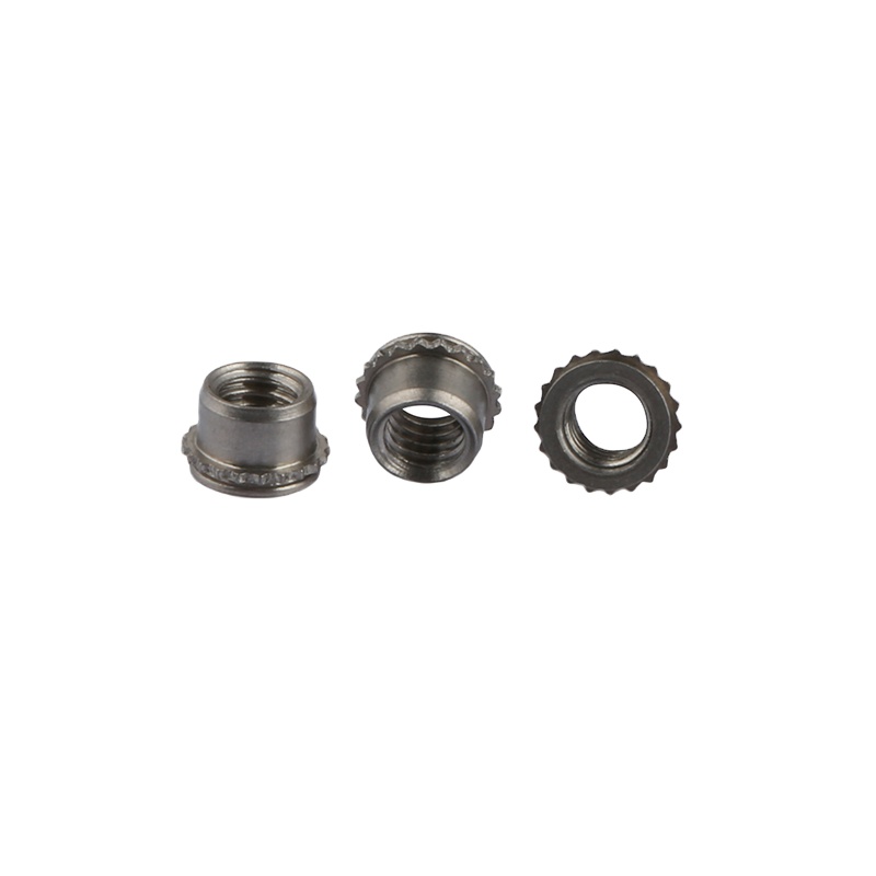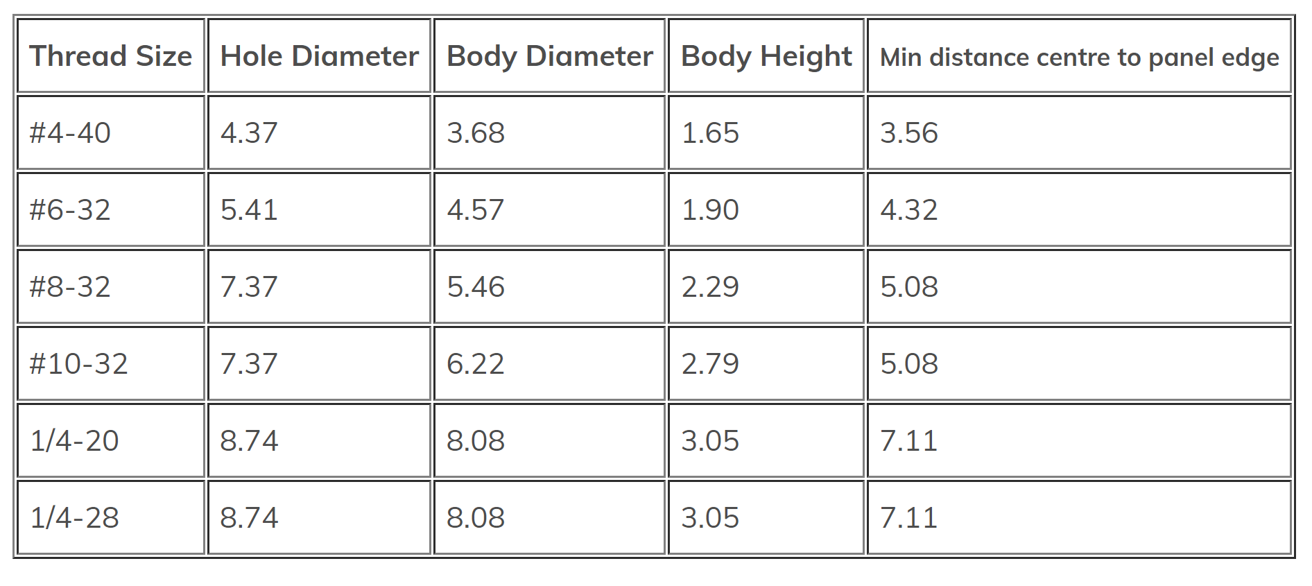 Made from 300 series stainless steel and suitable for installation into material of up to HRB70 hardness. Installation must be with a press using either a hollow punch or anvil so that pressure is applied to the knurled ring directly.