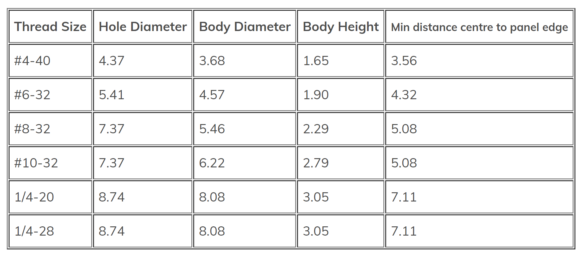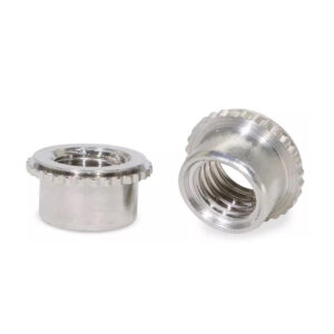 Made from 300 series stainless steel and suitable for installation into material of up to HRB70 hardness. Installation must be with a press using either a hollow punch or anvil so that pressure is applied to the knurled ring directly.