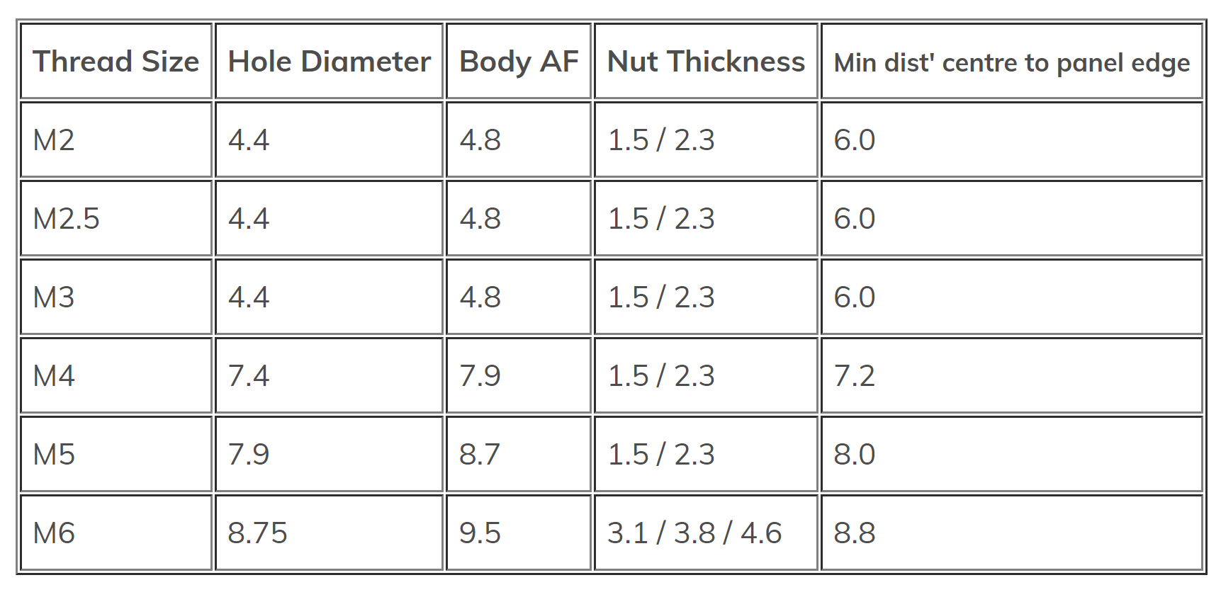 These clinch flush nuts provide a METRIC thread in sheets as thin as 1.5mm, with no protrusion on either surface of the sheet.