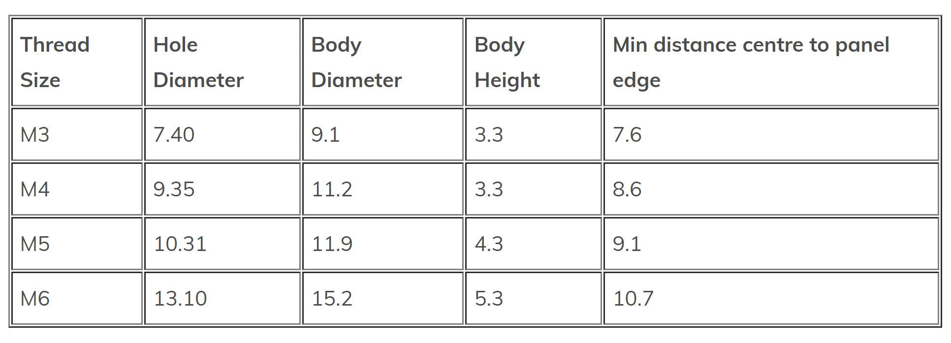 Floating clinch nuts have the same features as regular clinch nuts with the additional benefit of accommodating up to 0.8mm ‘off-centre’ screw alignment.